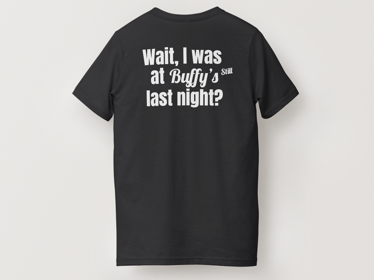 We’ve all been there — you wake up, check your phone, and suddenly everything makes sense. The “Wait, I Was at Buffy’s Last Night?” A T-shirt is for those mystery mornings after one too many “just one more” rounds at the local legend itself.